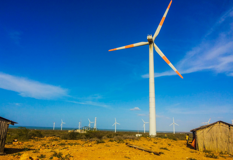 Foto: Jorge Mahecha, 2014, Molino de viento junto a casas Wayuu en el desierto de la Guajira, Parque Nacional Macuira, CC BY SA 3.0
